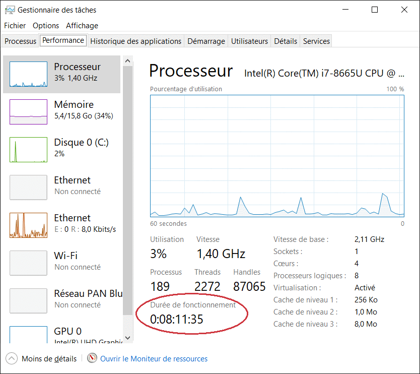 Pour obtenir la durée de fonctionnement de Windows et donc la date du dernier démarrage il suffit de :